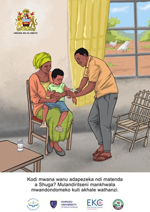 (Educational poster on childhood diabetes in the major national language Chichewa translation: Has your child been diagnosed with diabetes? Give your child’s medication as directed to keep her/him healthy.)